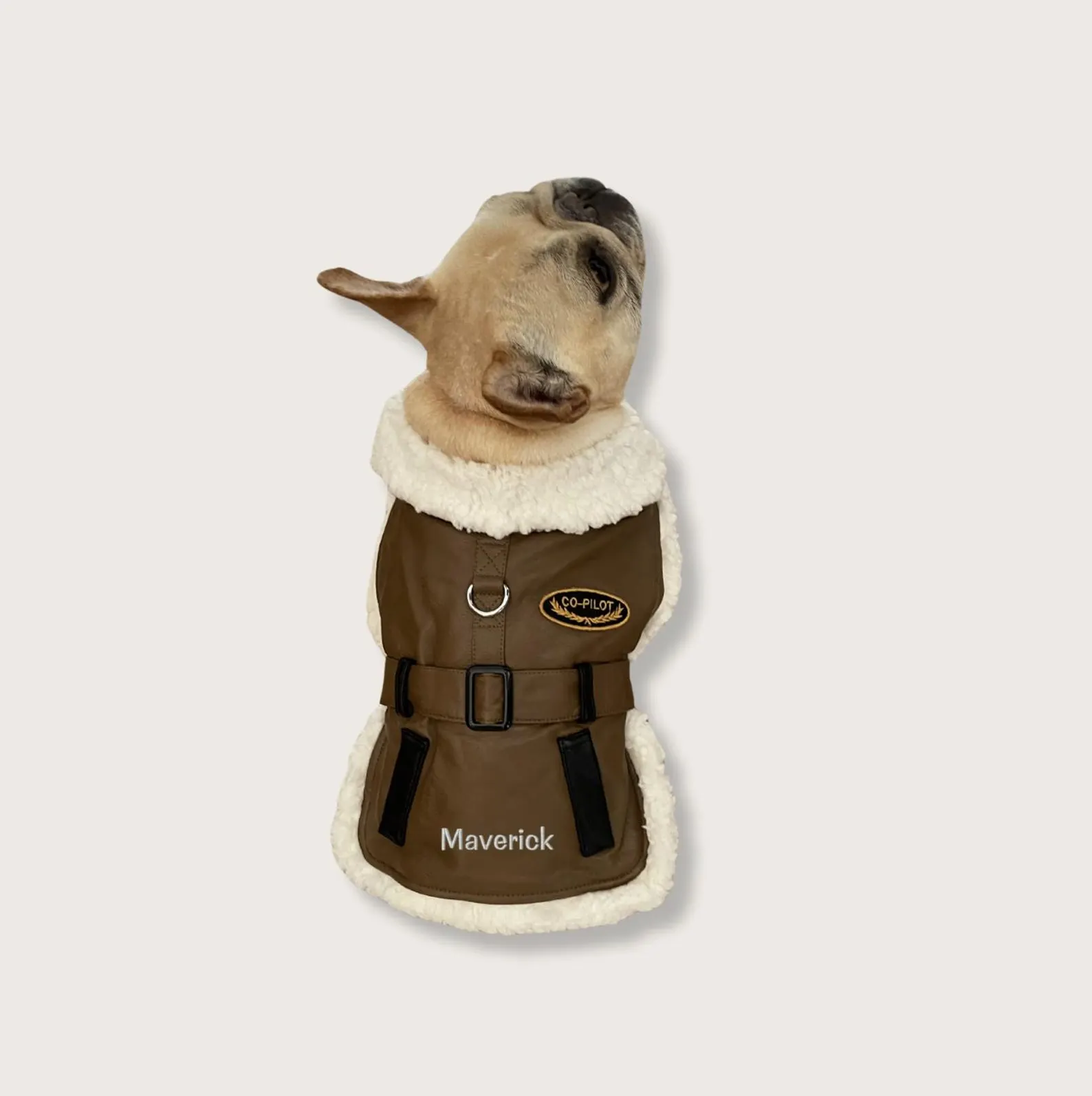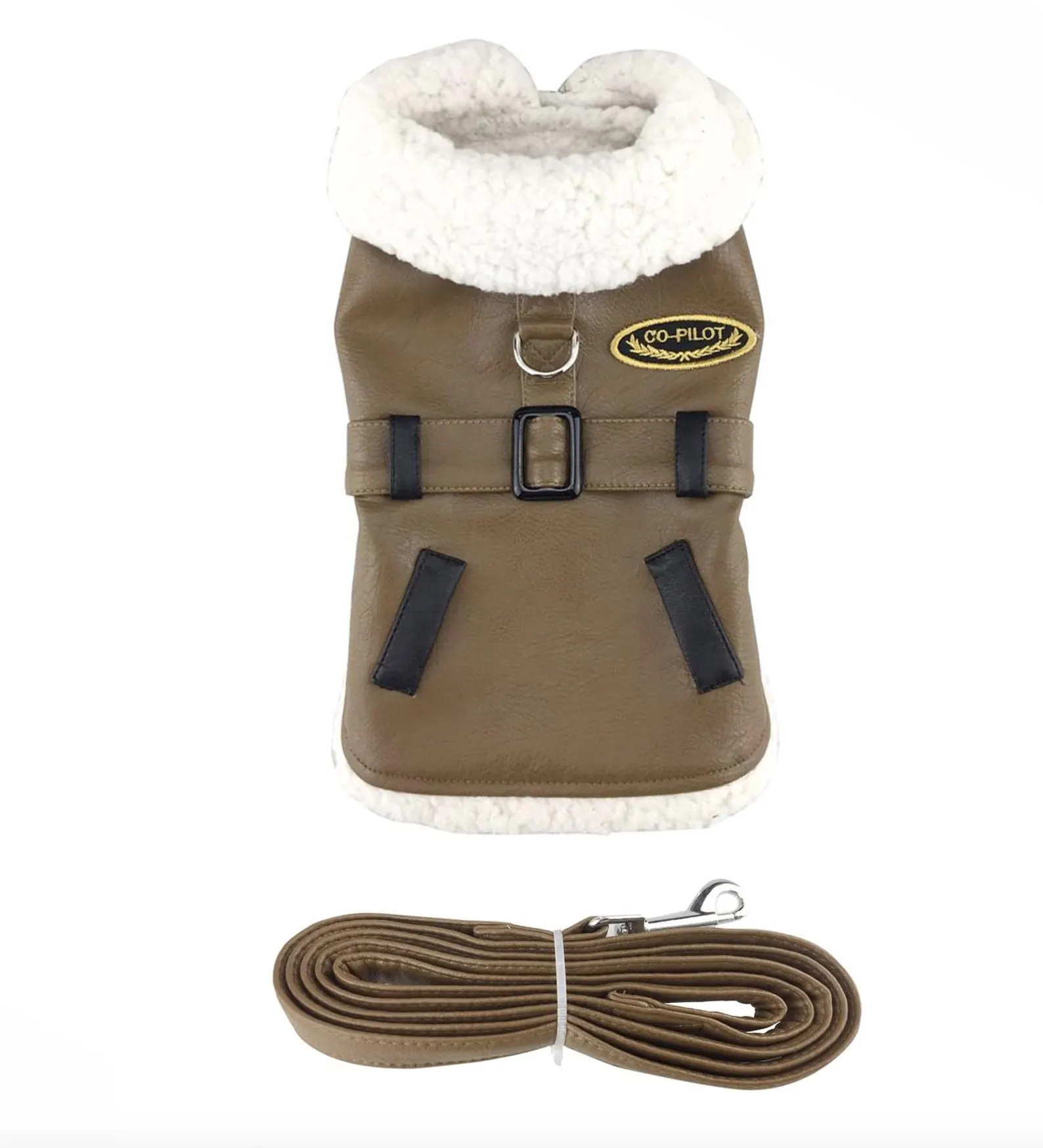 Keep your pet warm and stylish with our faux leather jacket featuring a cozy shearling lining, adjustable velcro closure, and a matching leash. Personalize it with their name for a unique touch!