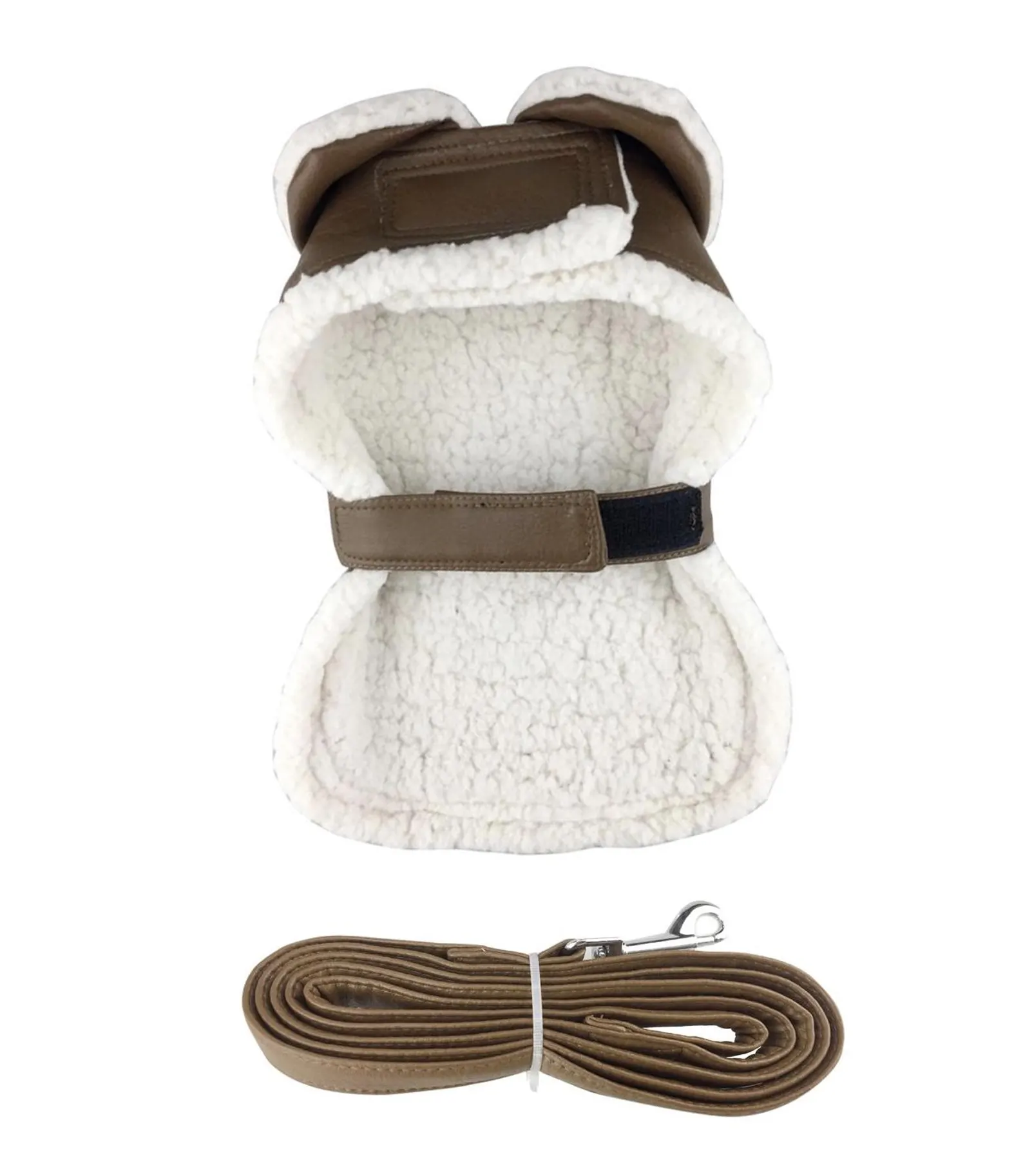 Give your pet a fashion-forward look with our brown faux leather jacket, featuring black accents and a plush vintage shearling lining for extra warmth. Insulated for comfort, this jacket is perfect for chilly days and comes with an adjustable hook-and-loop closure for easy on/off. Plus, it includes a matching leash for a complete, stylish set!
